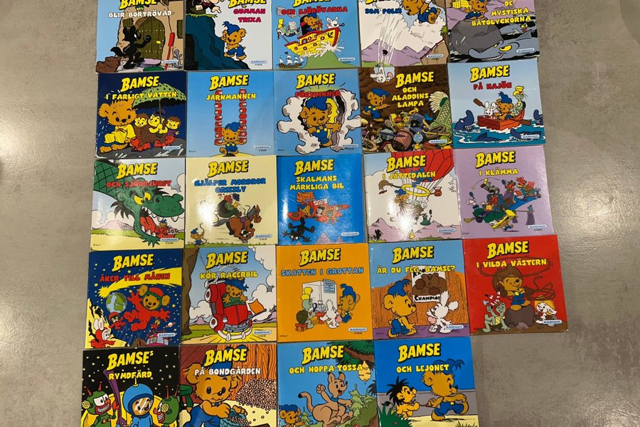 En samling av Bamse böcker. Perfekt för barn. Innehåller titlar som 'Bamse blir bortrövad', 'Gumman Trixa', 'Och sjörövarna', 'Som polis', 'De mystiska båtolyckorna', 'I farligt vatten', 'Järnmannen', 'Försvinner', 'Och Aladdins lampa', 'På hajön', 'Och sjöodjuret', 'Hjälper morbror Grizzly', 'Skalmans märkliga bil', 'I jättedalen', 'I klämma', 'Åker till månen', 'Kör racerbil', 'Skatten i grottan', 'Är du feg, Bamse?', 'I vilda västern', 'Rymdfärd', 'På bondgården', 'Och hoppa-Tossa', 'Och lejonet'.