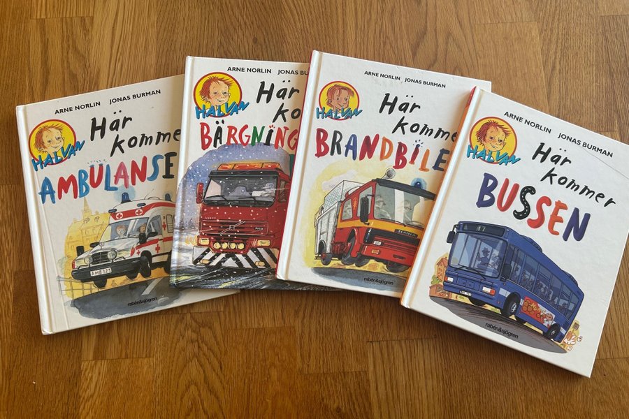 Fyra böcker i ”Här kommer”-serien av Arne Norlin och Jonas Burman. Böckerna heter ”Här kommer Ambulansen”, ”Här kommer Bärgningen”, ”Här kommer Brandbilen” och ”Här kommer Bussen”.