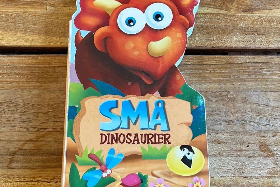 En färgglad barnbok med titeln "Små dinosaurier" med en tecknad triceratops på omslaget.