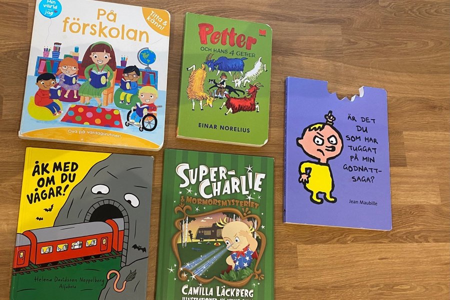 Ett paket med fem barnböcker. Innehåller titlarna: På förskolan, Petter och hans 4 getter av Einar Norelius, Super-Charlie & mormorsmysteriet av Camilla Läckberg, Är det du som har tuggat på min godnattsaga? av Jean Maubille, och Åk med om du vågar! av Helena Davidsson Neppelberg.
