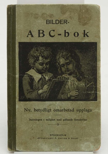 Bilder-ABC-bok. Bilder-ABC-bok. Ny betydligt omarbetad upplaga. Stavningen i enlighet med gällande föreskrifter. [=Omslagstitel.] Illustrerad. Stockholm, Herzog & Söner, 1926. 12:o. 24 s. Klammerhäftat ngt nött och väl använt grönt klotryggsbd.
