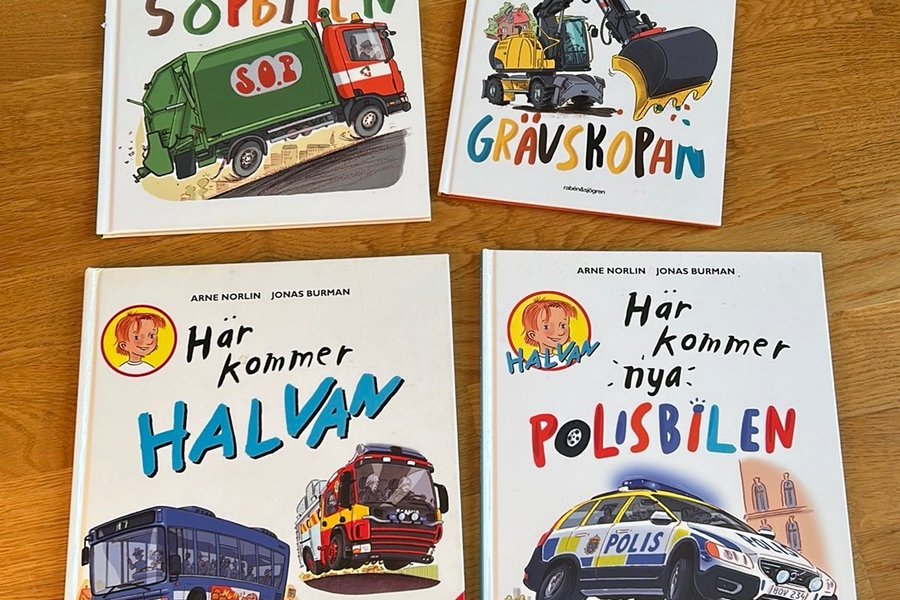 Fyra Halvan barnböcker av Arne Norlin och Jonas Burman. Böckerna heter "Här kommer sopbilen", "Här kommer grävskopan", "Här kommer Halvan" och "Här kommer nya polisbilen".