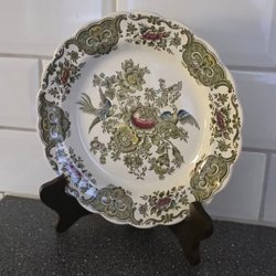 Material: Högkvalitativt porslin. Mönster: Klassiskt blåvitt mönster "Blå lök". Egenskap: Skålens form imiterar ett löv, vilket är ett typiskt element för denna typ av servis. Tillverkare: Dekoren och markeringarna (korsade svärd) indikerar Meissen-fabriken, känd för sina historiska och samlarvärdiga porslin.