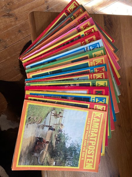 Ett parti Kamratposten tidningar från 1972. Tidningarna har färgglada omslag och innehåller reportage, bland annat om Thailand.