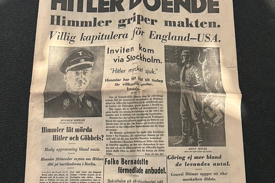 Tidningen Göteborgs-Posten från den 25 april 1945. Stora rubriker om Hitler, Himmler och krigsslutet.