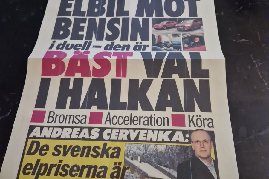 Tidning med rubriker om elbilar mot bensinbilar och elpriser. Innehåller även sudoku.