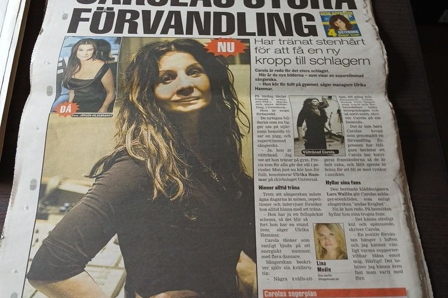 Tidningsurklipp med Carola Häggkvist. Artikeln heter "Carolas stora förvandling" och handlar om hennes förberedelser inför Schlager-SM 2006. Hon har tränat hårt för att få en ny kropp till schlagern. Artikeln nämner även att hon har korrigerat framtänderna och använt botox. Lars Wallin har designat scenkläderna. Carola beskriver sin kvällsrutin och segerplan.