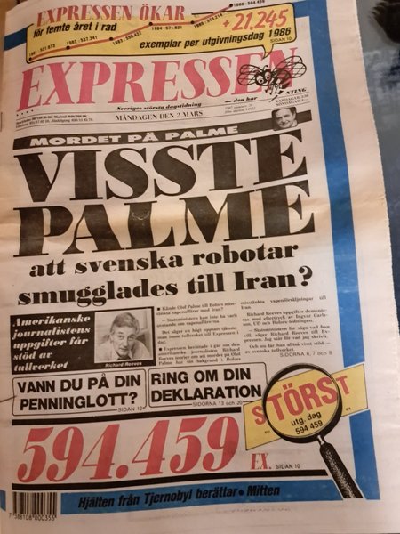Tidning Expressen från måndagen den 2 mars 1987. Framsidan har rubriken "Mordet på Palme" och "Visste Palme att svenska robotar smugglades till Iran?". Tidningen innehåller även artiklar om "Hjälten från Tjernobyl berättar".
