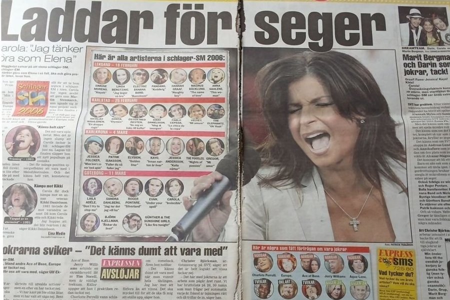 Tidningsurklipp från Melodifestivalen 2006 med rubriker som "Laddar för seger" och "Carola: Jag tänker göra som Elena". Innehåller även listor över artister som deltog i tävlingen.