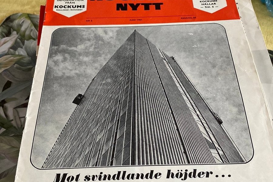 Tidning från juni 1961 med information från Kockums. Tidningen har rubriker som "Mot svindlande höjder..." och "Elegant nykomling i Kockums spisfamilj".