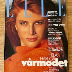 Tidningen ELLE från mars 1990, med Angie Everhart på omslaget. Intervju med Dolly Parton, reportage av Stina Dabrowski och 1990 års vårmode.