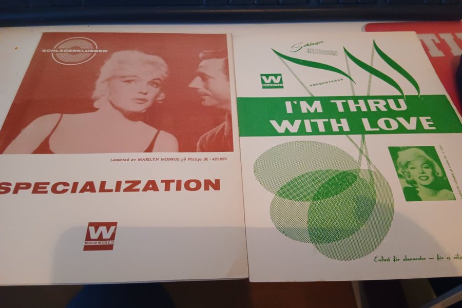0Marilyn Monroe. Det ena är märkt "Lanserad av MARILYN MONROE på Philips BE-429892" och det andra "I'M THRU WITH LOVE" med texten "Endast för abonnenter – får ej sälja".