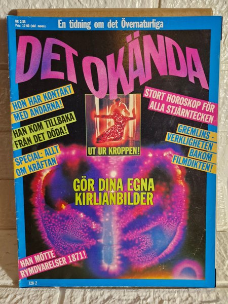 Tidning om det övernaturliga. Innehåller artiklar om kontakt med andar, återkomst från de döda, Kirlianbilder, rymdvarelser och horoskop. NR 2/85