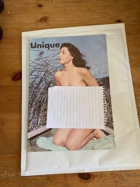 mått 29,5 x 21 cm. 16 sidor. bara foton. Tidningen "Unique" med en kvinna på omslaget.