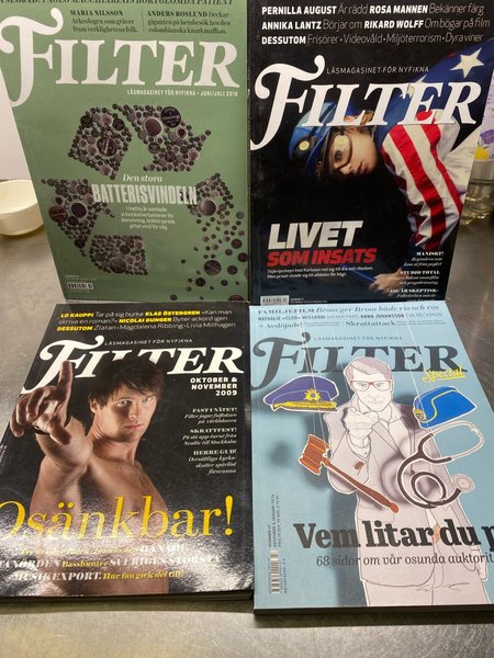 Fyra tidningar från Filter. Utgåvorna är juni/juli 2016, december 2010/januari 2011, oktober/november 2009 och en specialutgåva december 2010/januari 2011.