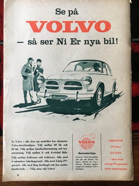 En annons för Volvo. Den beskriver olika modeller som Amazon, PV 544 och Duett. Den nämner även garantier och utrustningsalternativ.