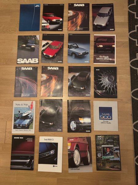 Broschyrer för Saab 900, Saab 99, Saab 9000 och Saab Original Tillbehör. 20 stycken broschyrer