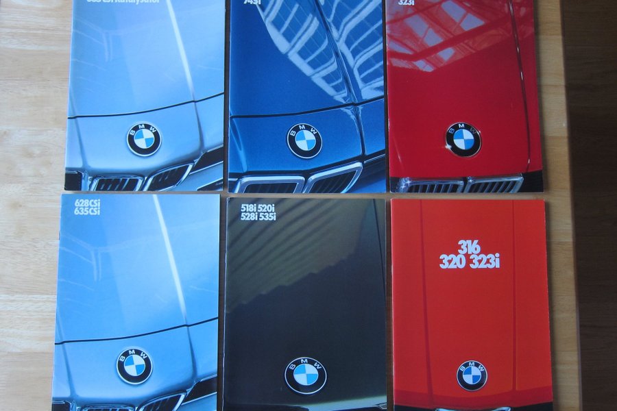 6 st BMW-broschyrer, tjocka kataloger i mycket bra skick. 3-serie -79, de övriga är från 1985: 3-serie, 5-serie, 7-serie samt två st 6-serie. Alla är svenskspråkiga utom de två 6-seriebroschyrerna - en av dem är på tyska och den andra på engelska.