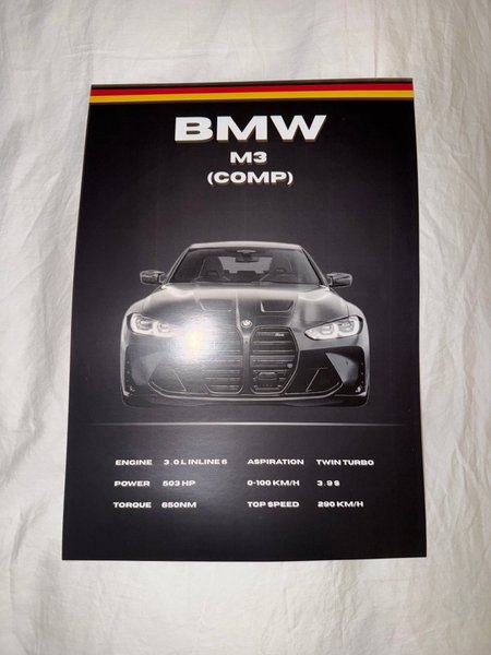 Hej säljer min egengjorda Affisch med en BMW M3 (COMP). Specifikationer inkluderar en 3.0 L inline 6-motor, 503 hk, 650 Nm i vridmoment, dubbelturbo, 0-100 km/h på 3.9 sekunder och en topphastighet på 290 km/h.