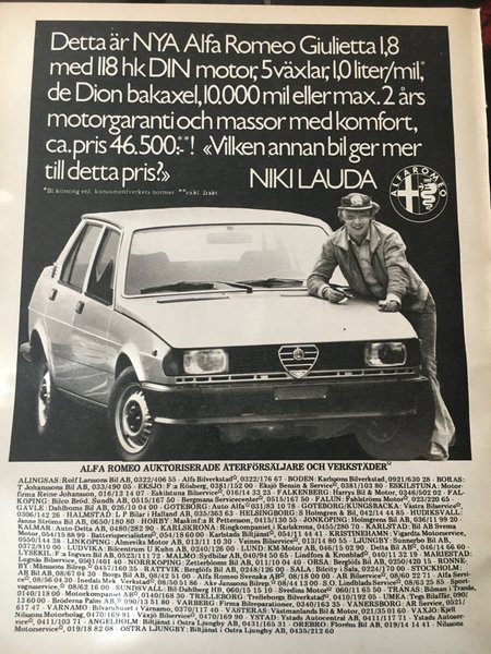 En annons för Alfa Romeo Giulietta 1,8. innehåller information om bilen och en bild av Niki Lauda.