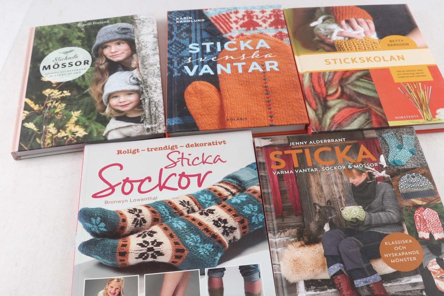 Handarbete, Stickning. Innehåll: Ingvill Freland, Stickade mössor och andra accessoarer för stora och små (Legind, 2019. Inbunden. 138 s. Med en liten stötskada på ryggen.) + Jenny Alderbrandt, Sticka varma vantar, sockor och mössor (Bokförlaget Semic, 2017. Inbunden. 110 s.) + Karin Kahnlund, Sticka svenska vantar (Polaris, 2024. Inbunden. 151 s.) + Bronwyn Lowenthal, Sticka sockor: Roligt - trendigt - dekorativt (Valentin, 2008. Danskt band. 128 s.) + Betty Barnden, Stickskolan (Norstedts, 2010. Inbunden. 160 s.). Samtliga volymer i gott skick om ej annat anges ovan.