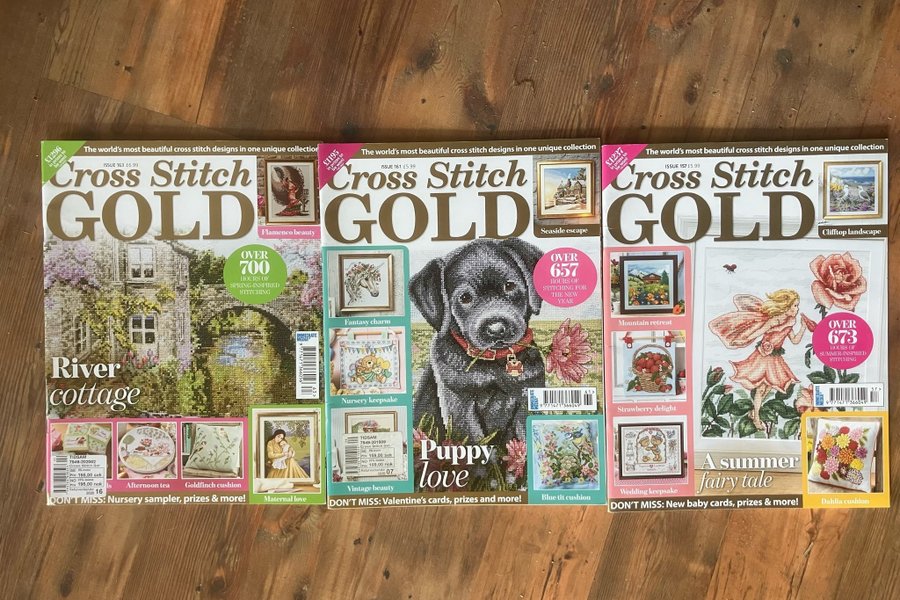 3 nummer av den engelska korsstygnstidningen Cross Stitch Gold med massor av fina mönster. Nr 157, 161 och 163. Jättefint skick! Samfraktar gärna! Välkommen med ett bud!