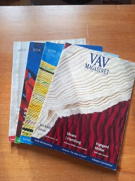 VÄV MAGASINET, årgång 2004, komplett med nummer 1, 2, 3 och 4. Innehåller artiklar om vävare i Hamburg, veckade vävar och Solkustens Spinnverkstad.