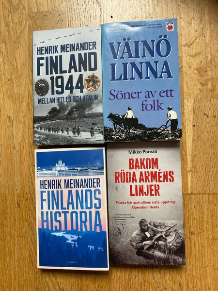 Boken ”Finland 1944: Mellan Hitler och Stalin” av Henrik Meinander. Denna historiska redogörelse utforskar Finlands position och händelser under slutskedet av andra världskriget, inklämt mellan två stormakter.