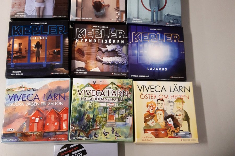 Bokpaket med ljudböcker av Kepler och Viveca Lärn. Innehåller titlarna: Eldvittnet, Kaninjägaren, Sandmannen, Stalker, Hypnotisören, Lazarus, Södra vägen till Saltön, Halta hönans hotell, Öster om Heden, Sanningen om Saltön.