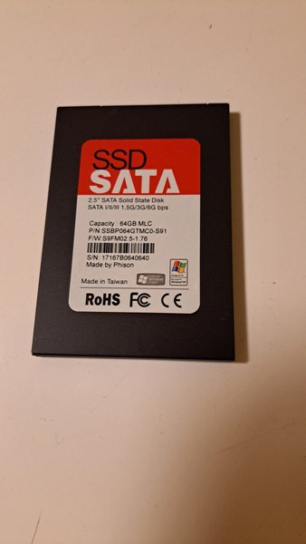 2.5" SATA Solid State Disk SATA I/II/III 1.5G/3G/6G bps Capacity: 64GB MLC P/N: SSBP064GTMC0-S91 F/W: S9FM02.5-1.76 S/N: 17167B0640640 Made by Phison Made in Taiwan
