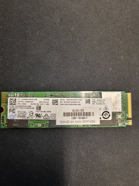 Säljer en Intel SSD, modell SSDPEKNW512G8H. Specifikationer: * 512GB * HP P/N: L33592-001 * CT: UHNBA01SXCHJOS * HW: J63240-100 * SA: K22480-100 * SN: BTNH92740AZD512A