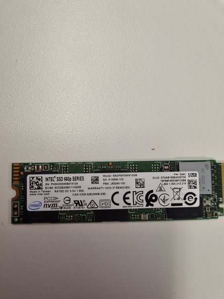 Intel SSD 660p Series. Modell: SSDPEKNW512G8 SA: K10634-102 PBA: J63240-100 512GB