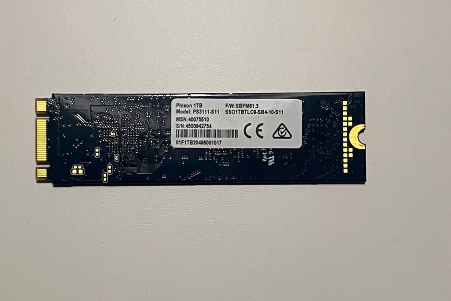 Phison 1TB SSD. Modell: PS3111-S11. F/W: SBFM61.3. MSN: 40075510. S/N: 4500942754. SSO1TBTLC9-SB4-10-S11. 01F1TB20496001017.