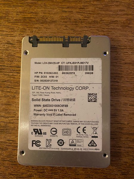 Solid State Drive från LITE-ON Technology CORP. Modell: LCH-256V2S-HP. Lagringskapacitet: 256GB. HP artikelnummer: 810262-002. Tillverkad i Taiwan.