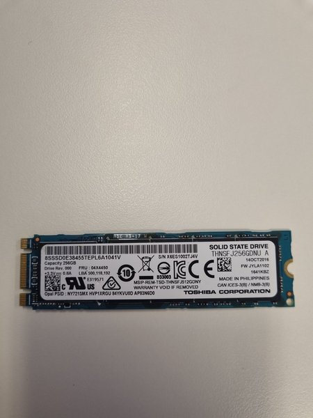 Solid State Drive från Toshiba med en kapacitet på 256GB. Modellbeteckningen är THNSFJ256GDNU A. Tillverkad i Filippinerna. Serienummer: X6ES1002TJ4V. FRU: 04X4450. LBA: 500,118,192. Firmware: JYLA1102. Tillverkningsdatum: 14 oktober 2016.