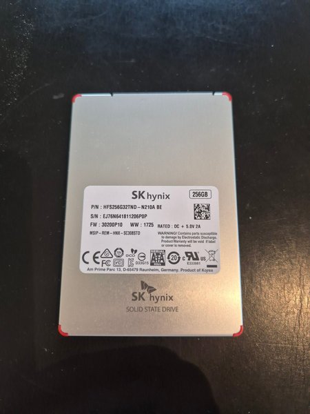 SK Hynix Solid State Drive (SSD) med en lagringskapacitet på 256 GB. Modellnummer HFS256G32TND-N210A BE. Serienummer EJ76N641811206POP. Firmware 30200P10. Tillverkad vecka 1725. Märkt med DC + 5.0V 2A. Produkten är tillverkad i Korea.