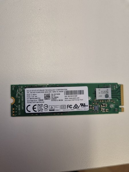 Solid State Drive från Solid State Storage Technology Corporation. Modell: CL1-8D512. P/N: 3C07140248. S/N: 002109101DSP. Tillverkad i Taiwan.