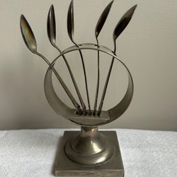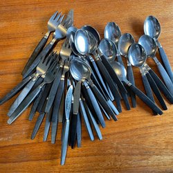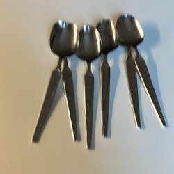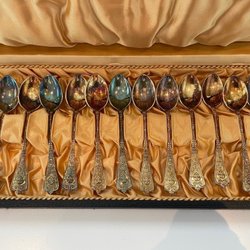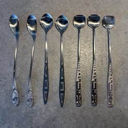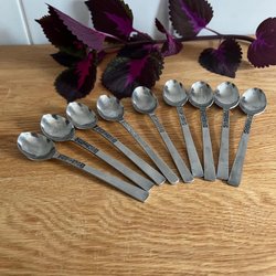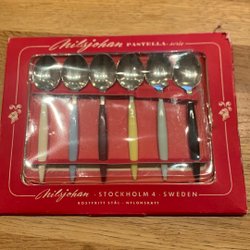 Set med 4 äldre dekorativa kaffeskedar och två större för socker mm. Har framkommit vid en hustömning.