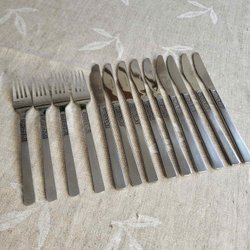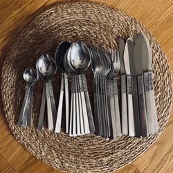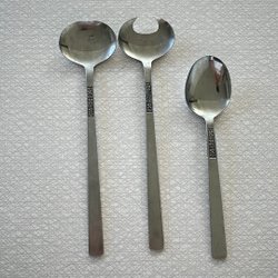 Retro uppläggningsbestick. 1 soppslev, 1 såsslev, 2 uppläggningsskedar, 1 uppläggningsgaffel, 1 smörkniv samt 3 påläggsgafflar.