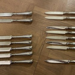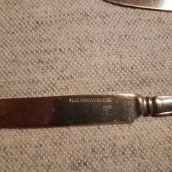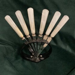 Fruktknivar med skaft i pärlemor. Rostfritt stål. Märke: Harrison Brothers & Howson. Etui.