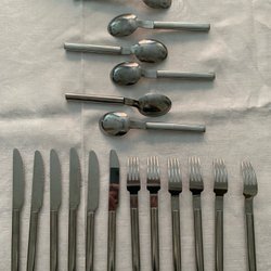 Bestick set med skedar, knivar och gafflar. 8 av vardera - en kniv är dock lite tjockare och en är lite skadad i toppen. Bra skick för övrigt De är 18,5 cm o kniven 19,5 cm.