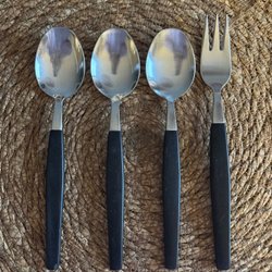 Detta bestickset består av 5 delar. I setet ingår 2 gafflar och 3 knivar. Besticken är tillverkade i rostfritt stål och har svarta handtag i bakelit. Varje del är märkt med 'ROSTFRITT STÅL'