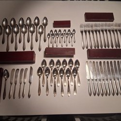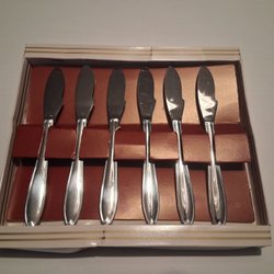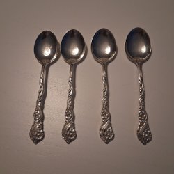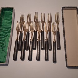 Set med 9 skedar. Skedarna har en dekorativ design på handtaget. Märkt med "MB" på skaftets baksida. Dessa kommer i en ask.
