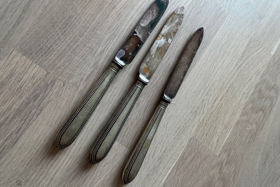 Tre äldre knivar med mönstrade handtag. Fina till ostbrickan. Behöver putsas