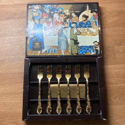 Set med sex guldfärgade skedar från Scandia Guld. Skedarna har detaljerade handtag och presenteras i en dekorativ låda.
