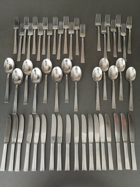 Några knivar är lite anfrätta med nagg. Någon gaffel är lite mörkare i metallen. Övrigt gott skick.