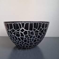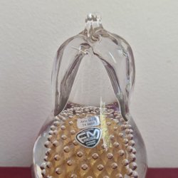 Burk i glas med lock och handtag i metall. Orangefärgat glas med vita prickar. Normal bruksslitage. Inga sprickor eller missfärgningar.