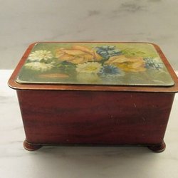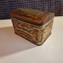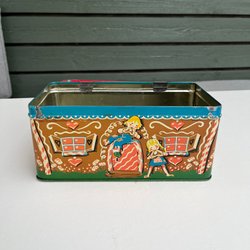 En jättesöt plåtlåda med motiv av plommon på framsidan. Dess lock är rött och själva asken är vit/beige.
