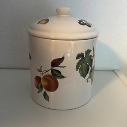 En porslinsburk från AIA Selection med plommon motiv. Lock i plast. Höjd 10 cm, 8 cm i diameter.