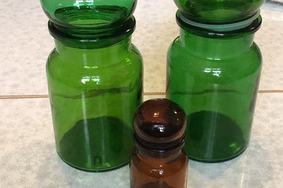 Tre retro burkar med lock. Ett grönt lock saknar plastringen , annars är allt helt och fint